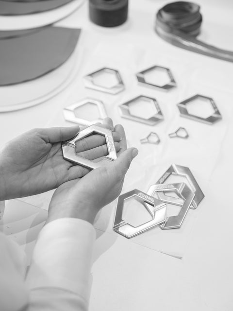 ADONE è eleganza, tradizione, rinnovamento. Dai bozzetti di Anna nascono il logo e l’iconica fibbia, solo elemento decorativo della borsa per esaltarne la forma.