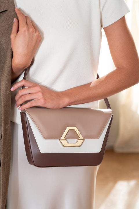 "Lady AD nasce dalla ricerca di un nuovo equilibrio. Mettere in ordine le idee attraverso linee geometriche e speculari. Così nel laboratorio di Adone prende corpo una borsa simmetrica e classica. Un rigore di forma che dialoga con la morbidezza della pelle e i colori caldi della terra. Lady AD emana quel famoso senso di quiet luxury che va oltre il trend, pensata per durare nel tempo ed essere indossata con raffinatezza."